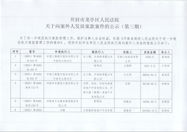 为了进一步规范执行案款管理工作,维护当事人合法权益,依据《河南省高级人民法院关于进一步规范执行案款管理工作的通知》,现将开封市龙亭区人民法院执行局向案外人发放的案款公示如下: