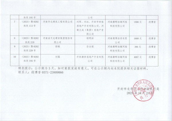 开封市龙亭区人民法院关于向案外人发放案款案件的公示(第三期)